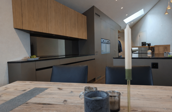 Sind Sie auf der Suche nach einer neuen Küche für Ihr Ferienhaus? Dann haben wir hier die richtige Inspiration: eine grifflose Poggenpohl Küche mit echtem Schweizer Stein, ausgestattet mit kieselgrauen Hochglanzfronten, die perfekt im Kontrast mit der holzigen Innenausstattung des Hauses steht und den Wohnraum lebendig macht.